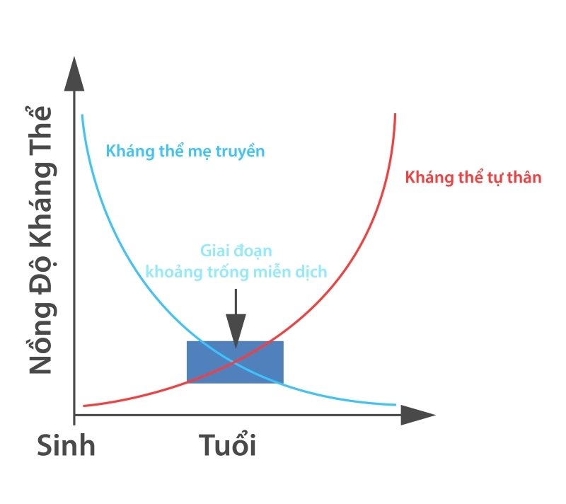 Lúc mới sinh ra, hệ miễn dịch của trẻ rất tốt nhờ hệ thống kháng thể dự trữ từ khi còn trong bào thai. Tuy nhiên “miễn dịch thụ động” không tạo được sức đề kháng lâu dài vì sau đó các kháng thể bắt đầu giảm mạnh trong 6 tháng tiếp theo. Do đó trẻ cần được bú mẹ ngay và bú mẹ hoàn toàn cho đến 6 tháng tuổi, vì đây là nguồn cung cấp kháng thể thụ động để duy trì khả năng miễn dịch. Tuy nhiên lượng kháng thể mẹ truyền sang con sẽ giảm dần theo thời gian. Bắt đầu từ 6 tháng tuổi, trẻ bước vào giai đoạn khoảng trống miễn dịch cho đến năm 3 tuổi. Đây là thời điểm bé phát triển nhận thức, học hỏi và khám phá xung quanh, nhưng cũng chính là lúc bé đối mặt với nhiều nguy cơ gây bệnh. Lúc này cơ thể bé rất nhạy cảm với các tác nhân gây bệnh từ môi trường bên ngoài, rất dễ bị các bệnh nhiễm trùng như tiêu chảy, viêm đường hô hấp...